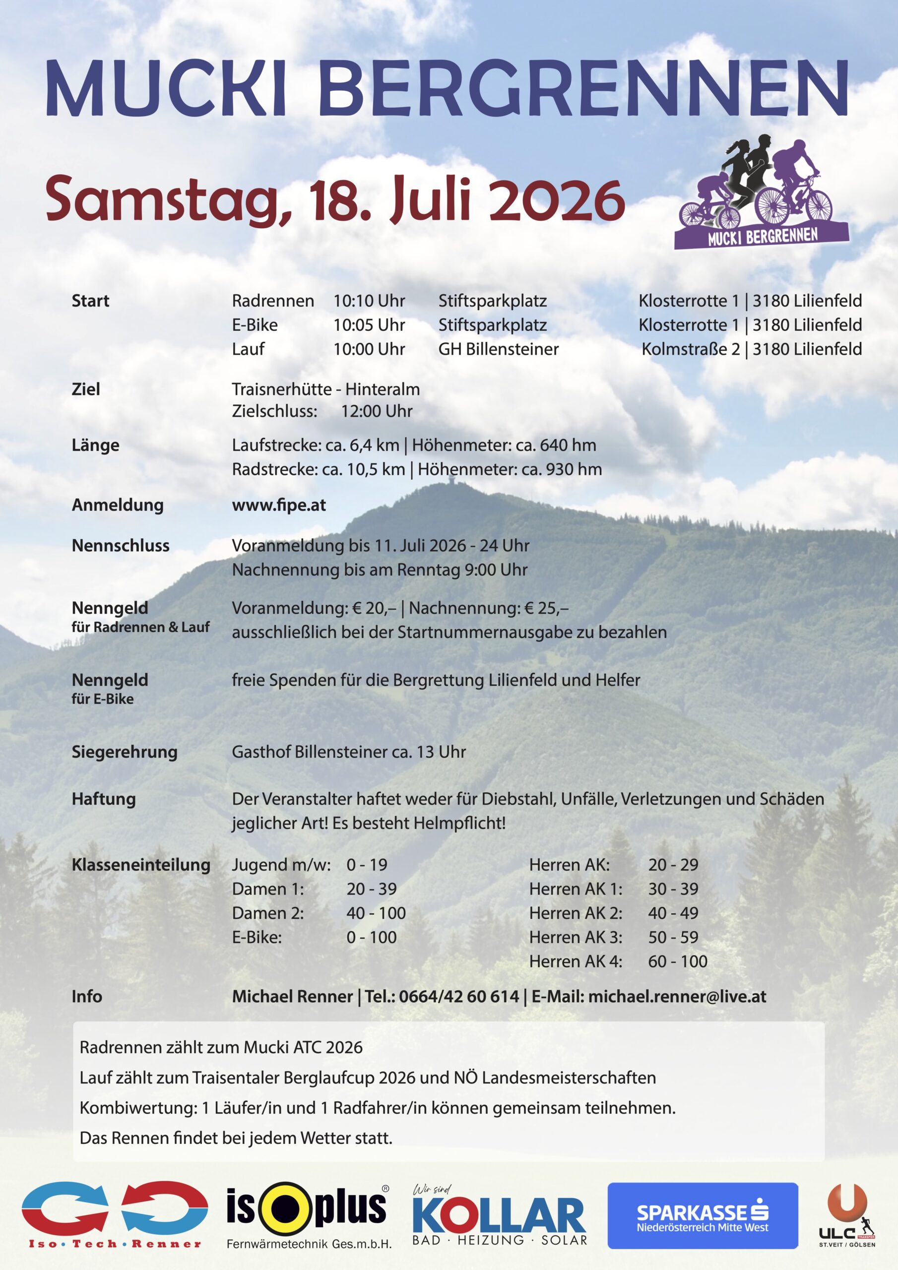 2022 feierte das erste Mucki Bergrennen auf dem Muckenkogel in Lilienfeld Premiere. Mittlerweile wird das Event in Kombination mit einem Berglauf sowie einer eigenen E-Bike-Klasse ausgetragen. Seit 2025 startet das Rennen im Tal beim Stiftsparkplatz, was für noch mehr Atmosphäre, Zuschauer*innen und sportliche Spannung sorgt.